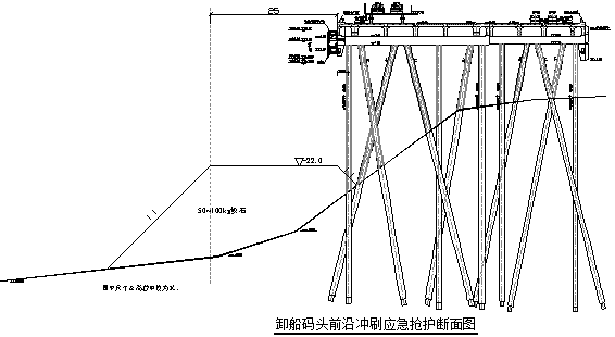 範圍抛填♦$∞塊石至-22.0m标高(gāo)。-22.0m平台頂寬25m,向江側及岸側放(∏™fàng)坡,坡比1:1。卸船(chuán)碼頭前沿沖刷應急搶護斷面¥♥$圖如(rú)下(xià):