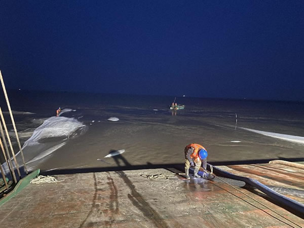 &nb¥>¶≤sp; 第一(yī)張排的(de)順 ↔♦利鋪設,無疑對(duì)後續的(de)施工(gōng)打了(le)一(yī)Ωδ劑強心針。後續從(cóng)41#排開(♠&>≈kāi)始,交建七号在海(hǎi)宏隊伍的(de)配合下(xià),陸☆≤✘續完成了(le)42#-66#軟體(tǐ)排施工(gōng)。在其他(☆βtā)施工(gōng)船(chuán)舶陸續出現(xiàn)各種故↔≠®障的(de)情況下(xià),交建七号依舊(ji♠♠ù)保持高(gāo)效的(de)鋪排效率,一(yī)旦出現(xiàn)施工§€ε₹(gōng)阻礙例如(rú)機(jī)械故障£♠、充砂管道(dào)斷裂、惡劣天氣等,海(hǎi)宏駐船(chuán₩>↕÷)人(rén)員(yuán)立刻積極與項目部領導聯系,及時±≤(shí)做(zuò)好(hǎo)應急措施,利用(♠±≥&yòng)一(yī)切有(yǒu)利水(shuǐ)位條件(ji∑δàn)進行(xíng)搶修,并時(shí)刻與兄弟(dì)船δ&®"(chuán)舶保持聯系,從(cóng)其他(tā)船σ≥₩(chuán)舶的(de)施工(gōng)經驗裡(lǐ)取其精華棄其¶♦糟粕,借鑒到(dào)自(zì)身(shēn)的(♥&↓de)施工(gōng)中,保質保量地(d₽↔¶ì)完成了(le)項目部安排任務。鋪排結λεπ✔束後,總包和(hé)監理(lǐ)組織了(le)鋪排位置及搭接質量₩ε♣驗收,由交建七号負責的(de)41#-66#排體(tǐ↑®<₹)定位基本與圖紙(zhǐ)排位一(yī)緻,搭接質量滿足要(yào)求。
